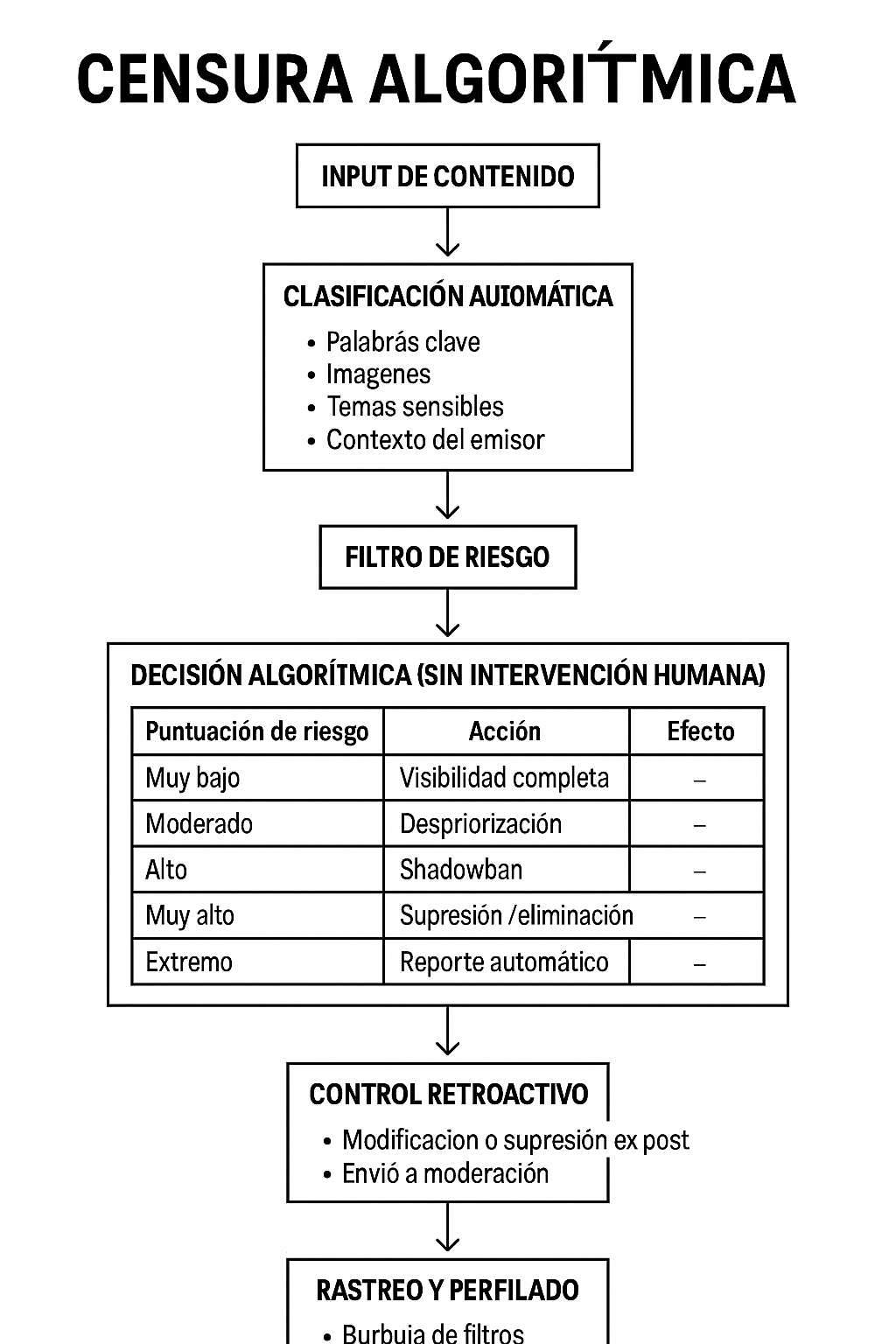 Esta priorización, a partir de un diseño tecnológico aparentemente neutral, configura en la práctica burbujas de filtro que segmentan a los usuarios en comunidades herméticas, reforzando sesgos y poniendo en tensión el espacio público democrático. Los contenidos que desafían las creencias dominantes o las corrientes activistas hegemónicas pueden ser invisibilizados mediante shadowbanning o reducción algorítmica del alcance sin transparencia ni apelación.